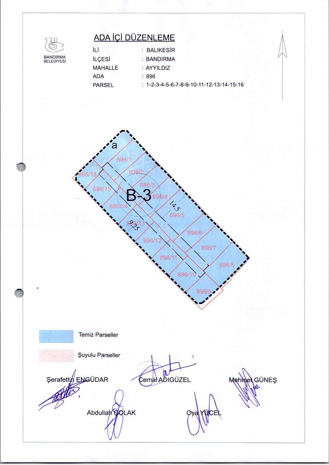 Belediye Encümeninin 26.11.2025 tarih ve 1312 sayılı Encümen kararı ile, Ayyıldız Mahallesi, 896 ada, 1-2-3-4-5-6-7-8-9-10-11-12-13-14-15-16 nolu parsellere ait ada içi düzenlemesinin, 1/1000 ölçekli Bandırma Uygulama İmar Planı notlarının 164. Maddesi ve 3194 sayılı İmar Kanununun 19. maddesi gereği onaylanmasına,