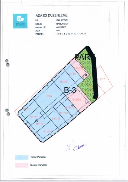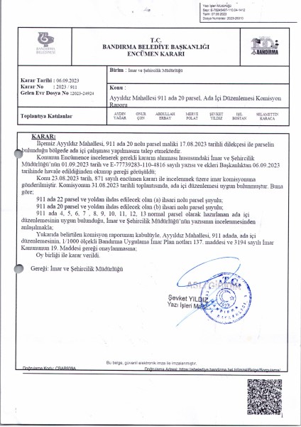 Belediye Encümeninin 06.09.2023 tarih ve 911 sayılı Encümen kararı ile Ayyıldız Mahallesi, 911 ada 4-5-6-7-8-9-10-11-12-13-20-22 parsele ait ada içi düzenlemesinin, 1/1000 ölçekli Bandırma Uygulama İmar Planı notlarının 137. Maddesi ve 3194 sayılı İmar Kanununun 19. maddesi gereği onaylanmasına,
