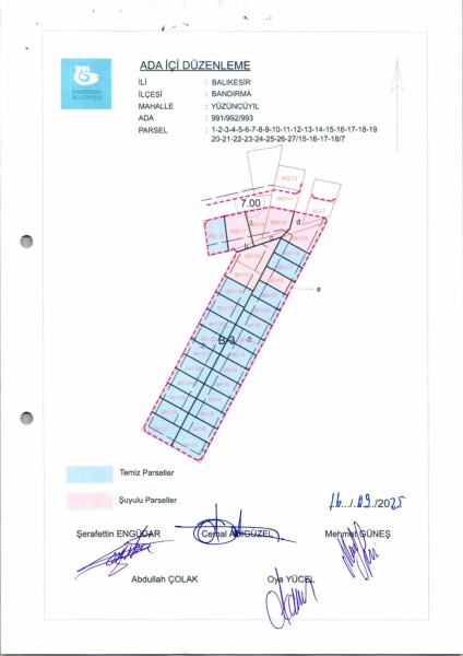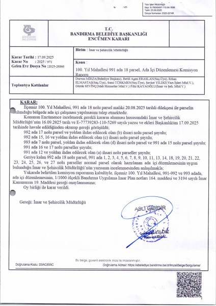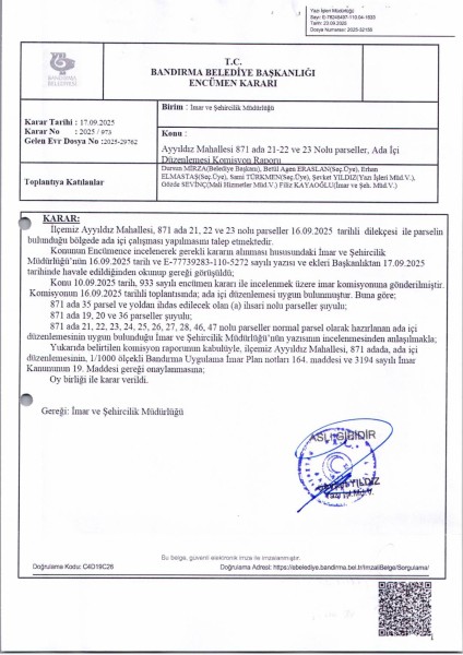 Belediye Encümeninin 17.09.2025 tarih ve 973 sayılı Encümen kararı ile, Ayyıldız Mahallesi, 871 ada, 19-20-21-22-23-24-25-26-27-28-35-36-46-47 nolu parsellere ait ada içi düzenlemesinin, 1/1000 ölçekli Bandırma Uygulama İmar Planı notlarının 137. Maddesi ve 3194 sayılı İmar Kanununun 19. maddesi gereği onaylanmasına,