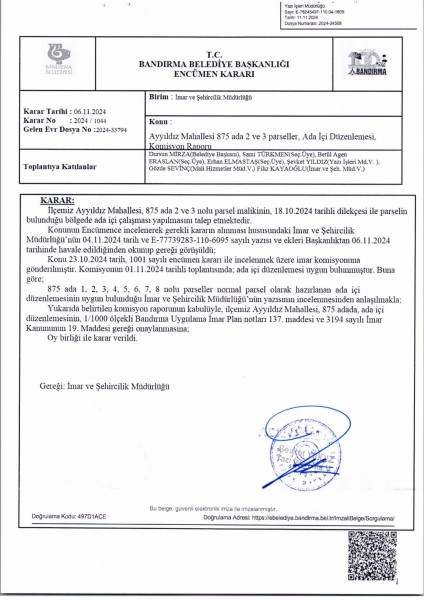 Belediye Encümeninin 06.11.2024 tarih ve 1044 sayılı Encümen kararı ile Ayyıldız, 875 ada, 1-2-3-4-5-6-7-8 nolu parsellere ait ada içi düzenlemesinin, 1/1000 ölçekli Bandırma Uygulama İmar Planı notlarının 137. Maddesi ve 3194 sayılı İmar Kanununun 19. maddesi gereği onaylanmasına,