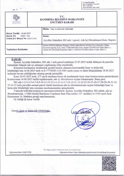 Belediye Encümeninin 18.06.2025 tarih ve 556 sayılı Encümen kararı ile, Ayyıldız Mahallesi, 882 ada 1-2-3-4-5-6-7-8-9-10-11-12-13-14-15-16-17-18-19-20-21-22-23-24-25-26-27-28-29-30-31-32-33-34-35 nolu parsellere ait ada içi düzenlemesinin, 1/1000 ölçekli Bandırma Uygulama İmar Planı notlarının 137. Maddesi ve 3194 sayılı İmar Kanununun 19. maddesi gereği onaylanmasına,