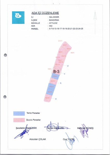 Belediye Encümeninin 08.10.2025 tarih ve 1067 sayılı Encümen kararı ile, Ayyıldız Mahallesi, 902 ada, 6-7-9-10-16-17-18-19-20-21-22-23-24-25 nolu parsellere ait ada içi düzenlemesinin, 1/1000 ölçekli Bandırma Uygulama İmar Planı notlarının 137. Maddesi ve 3194 sayılı İmar Kanununun 19. maddesi gereği onaylanmasına,