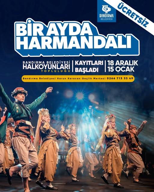 Geleneksel değerlerimizi yaşatmak ve gelecek kuşaklara aktarmak amacıyla Bandırma Belediyesi Halk Oyunları Topluluğumuzda Bir Ayda Harmandalı kursumuz başlıyor.