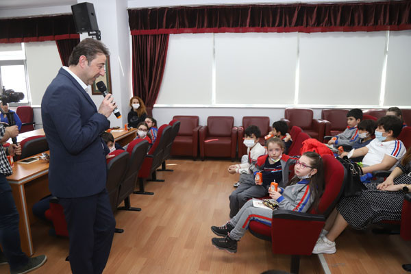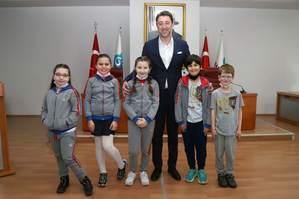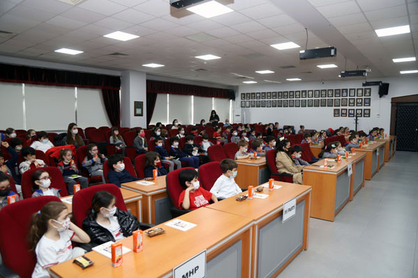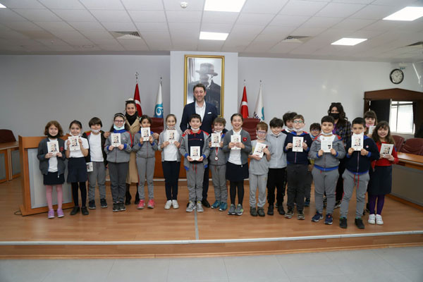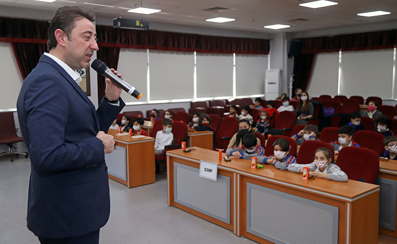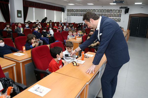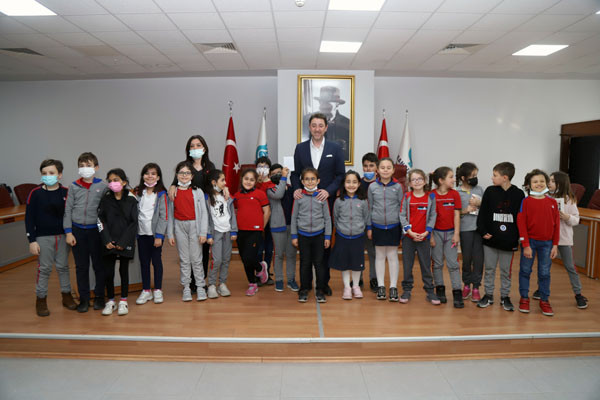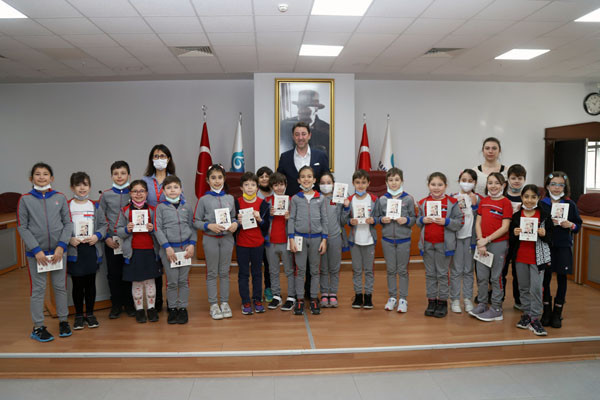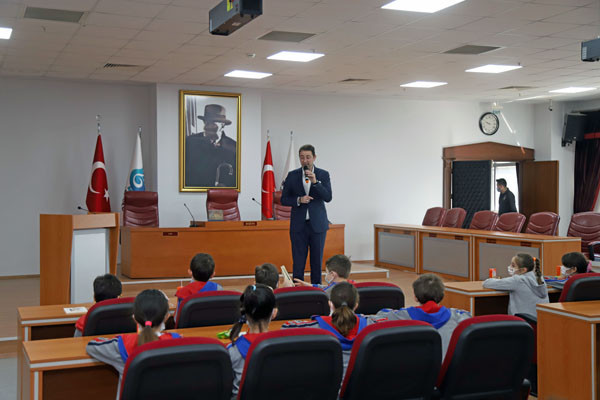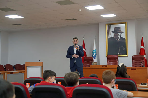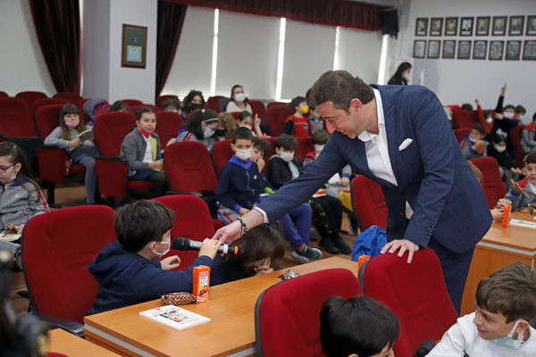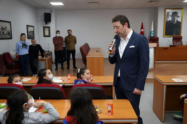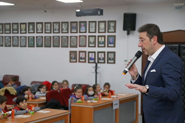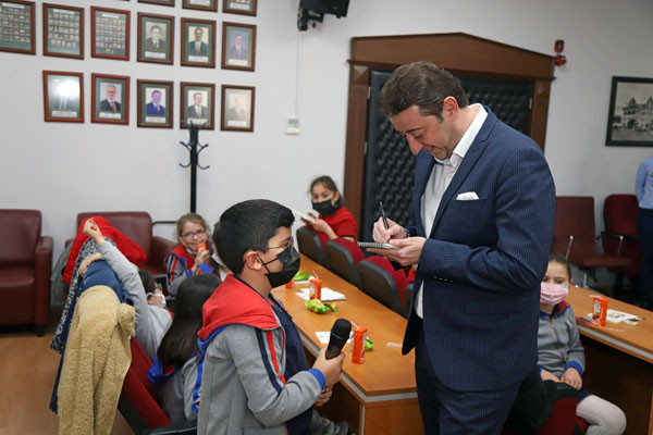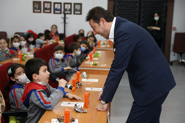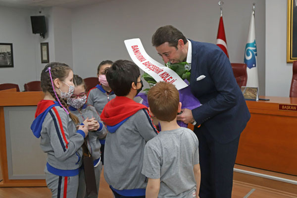 BANDIRMA BELEDİYESİNDE BUGÜN VE GELECEK BULUŞMALARI DEVAM EDİYOR Bahçeşehir Koleji 3. sınıf öğrencileri, öğretmenlerinin gözetiminde Bandırma Belediyesini ziyaret ettiler. Ziyaretin ilk bölümünde öğrenciler, Belediye Meclis Salonunda yapılan toplantıda Başkan Av. Tolga Tosun ile bir araya geldiler. Kendilerine kek ve meyve suları ikram edilen minikler, Belediye Başkanını adeta soru yağmuruna tuttular. Belediyenin görevlerini, iş makineleri ve araçlarını da merak eden miniklerin son sorusu şuydu: “Belediye Başkanlığı zor mu?”. Belediye Başkanı Av. Tolga Tosun, gülerek verdiği yanıtta: “Bir yönüyle çok zor. Çünkü, sizin gelecekte yaşayacağınız Bandırma için; oyun ve dinlenme parklarını, yeterli spor alanlarını, büyük cadde ve sokaklarını, kapsamlı kültür merkezlerini, yeni iş sahalarını şimdiden planlamak zorundayız. Bir yönüyle kolay. Çünkü; konusunda deneyimli, özverili, çalışkan bir ekibimiz var. Sizlere bugünden çok daha güzel bir Bandırma bırakmak için var gücümüzle çalışıyoruz” dedi. Bahçeşehir Koleji 3. sınıf öğrencileri, Belediye Başkanı Av. Tolga Tosun’a alkışlar ile teşekkür ederek çiçek takdim ettiler. Belediye Başkanı da; Atatürk’ün anılarını anlattığı ve çocuklar için sadeleştirilen Nutuk adlı eseri öğrencilere armağan etti. Meclis Salonundaki toplantının ardından, Kültür ve Sosyal İşler Müdürlüğü çalışanları misafir öğrencileri