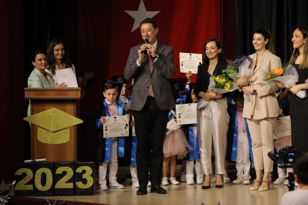 Eğitim Danışmanı Fatma Sibel Karabacakoğlu konuşmasında, “Pırlanta gibi çocuklar yetiştiriyoruz. Öğretmenlik, son derece kutsal bir meslektir. Mezun olan öğrencilerin öğretmenleri, çocuklardan ayrılacak olmanın getirdiği duygusal bir yoğunluk içindedir. Bu nedenle herkes öğretmen olmamalıdır. Öğretmen olanlar ise bizim öğretmenlerimiz gibi mesleğin gerektirdiği sorumluluğu layıkıyla yerine getirmelidir. Her bir çocuğu gökyüzünün ufkuna yayıyorum ve onların ayak bastıkları her yerde barışı, sevgiyi, hoşgörüyü ve saygıyı büyütmelerini diliyorum,” dedi.