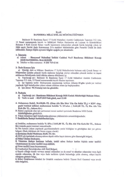 Bandırma Milli Emlak İlçe Müdürlüğü'nün 20375 sayılı ve 19/06/2019 evrak kabul tarihli yazısına istinaden Mülkiyeti Hazineye ait olan ilçemiz 17 Eylül Mahallesi 312 ada 15 parsel numaralı taşınmazın 02/07/2019 tarihinde 2886 sayılı Kanunun 51/a maddesine göre Pazarlık Usulü ile Yıkım İşi İhalesi Milli Emlak İlçe Müdürlüğünce yapılacaktır.