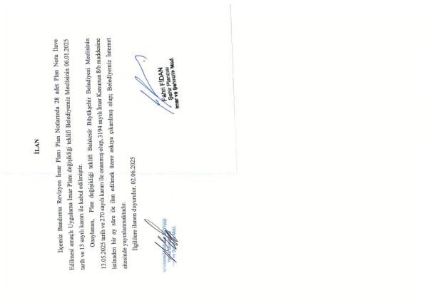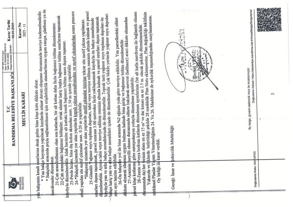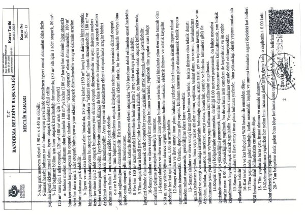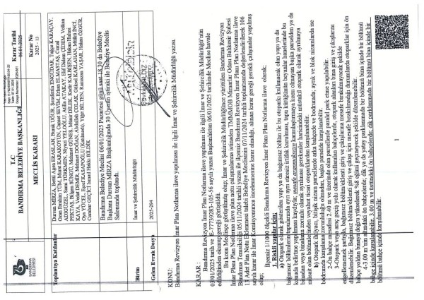 İlçemiz Bandırma Revizyon İmar Planı Plan Notlarında 28 adet Plan Notu İlave Edilmesi amaçlı Uygulama İmar Planı değişikliği teklifi Belediyemiz Meclisinin 06.01.2025 tarih ve 13 sayılı kararı ile kabul edilmiştir.