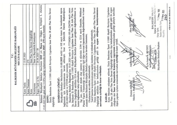 Onaylanan, Plan değişikliği teklifi Balıkesir Büyükşehir Belediyesi Meclisinin 13.05.2025 tarih ve 270 sayılı kararı ile onanmış olup, 3194 sayılı İmar Kanunun 8/b maddesine istinaden bir ay süre ile ilan edilmek üzere askıya çıkarılmış olup; Belediyemiz İnternet sitesinde yayınlanmaktadır.