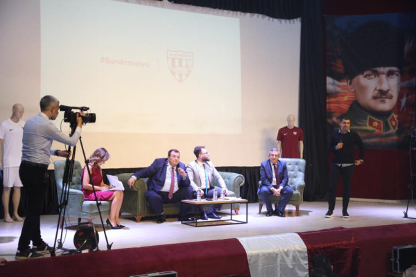BANDIRMASPOR’A DESTEK GECESİ DÜZENLENDİ   Belediye Başkanımız Av. Tolga Tosun, Barış Manço Kültür Merkezinde düzenlenen ve Egetürk TV’den de canlı yayınlanan Bandırmaspor Dayanışma ve Destek gecesine katıldı. Bandırma sevdalılarının, özel hazırlanan “Altın Amblemli” forma alarak ve BAĞIŞ yazıp 1709’a 10 TL karşılığında SMS atarak destek olduğu gecede, Belediye Başkanımız Av. Tolga Tosun’da daha önce almış olduğu 500 adet formaya bu gecede 750 adet ekleyerek toplamda 1250 adet forma alarak katkıda bulundu.