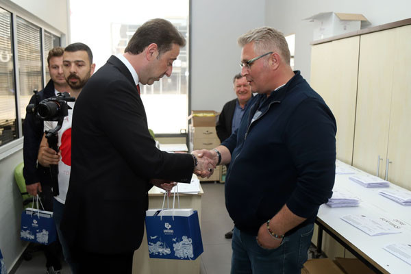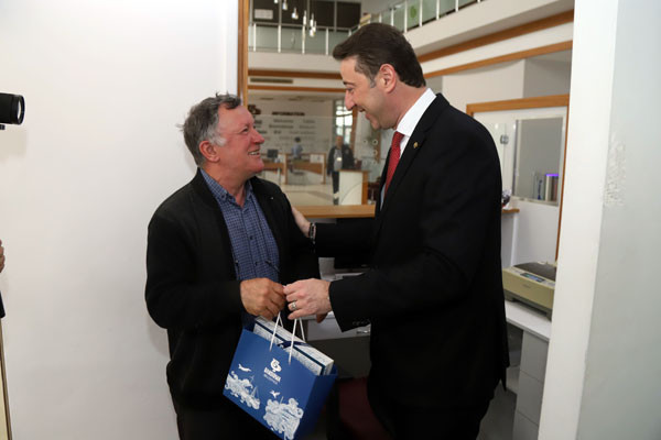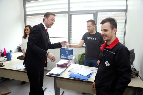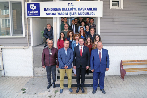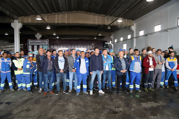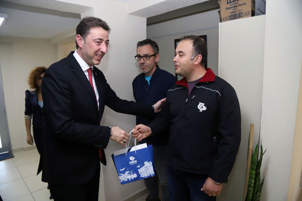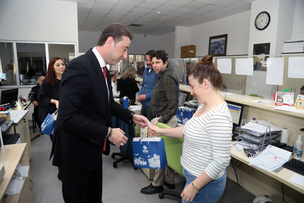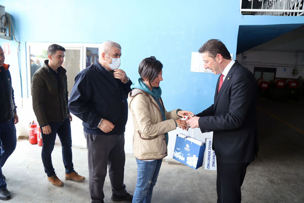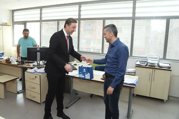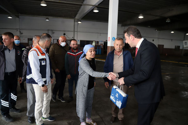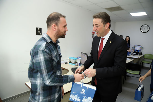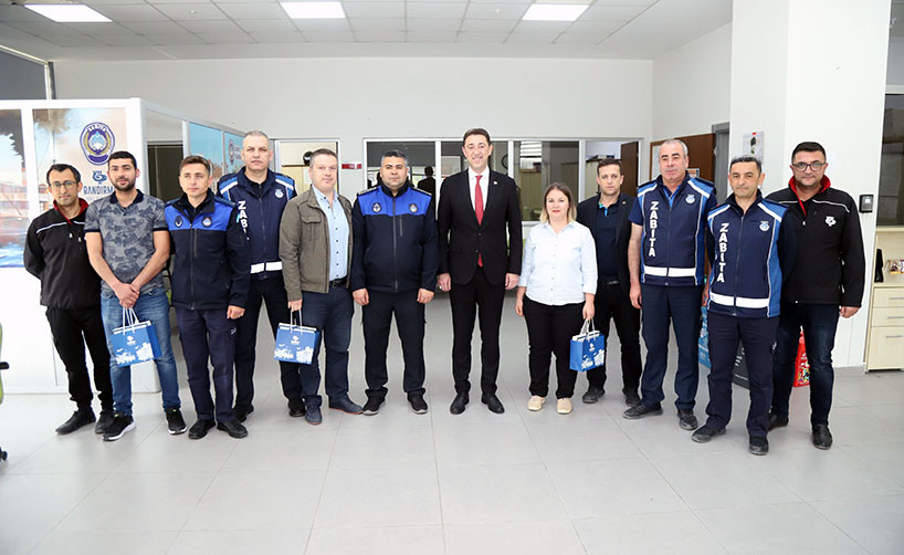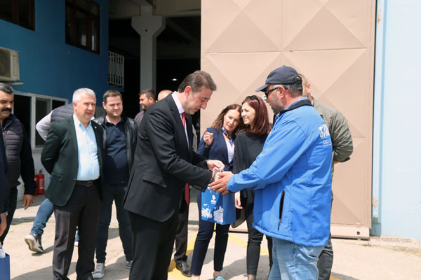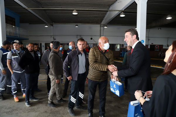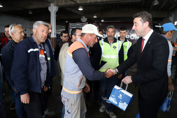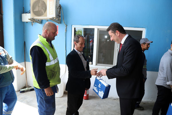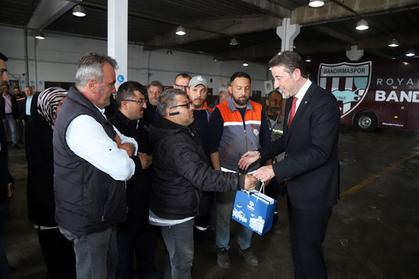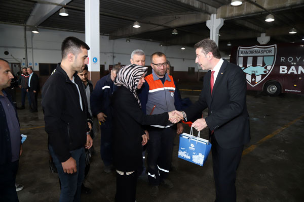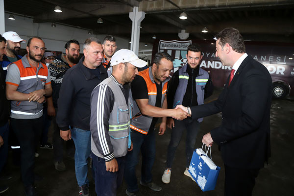 BAŞKAN TÜM BELEDİYE ÇALIŞANLARININ TEK TEK BAYRAMINI KUTLADI Bugün mesai saatleri sonrasında kamu çalışanları Ramazan Bayramı tatiline giriyor. 1 Mayıs Emek ve Dayanışma Günü’nün tatil günlerine denk gelmesi nedeniyle de, Bandırma Belediye Başkanı Av. Tolga Tosun, belediye çalışanlarını tek tek ziyaret ederek hem Ramazan Bayramlarını hem de Emek ve Dayanışma Günlerini kutladı. İlk olarak Bandırma Belediyesi Merkez Hizmet Binasında gerçekleşen kutlama ziyaretleri daha sonra Belediye Şantiyesinde devam etti. Belediye Başkanı Tolga Tosun, isimleri ile hitap ettiği tüm çalışanların hatırlarını sorduktan sonra kendilerinin ve ailelerinin bayramlarını kutlayarak çikolata ve kolonyadan oluşan hediye paketleri armağan etti.