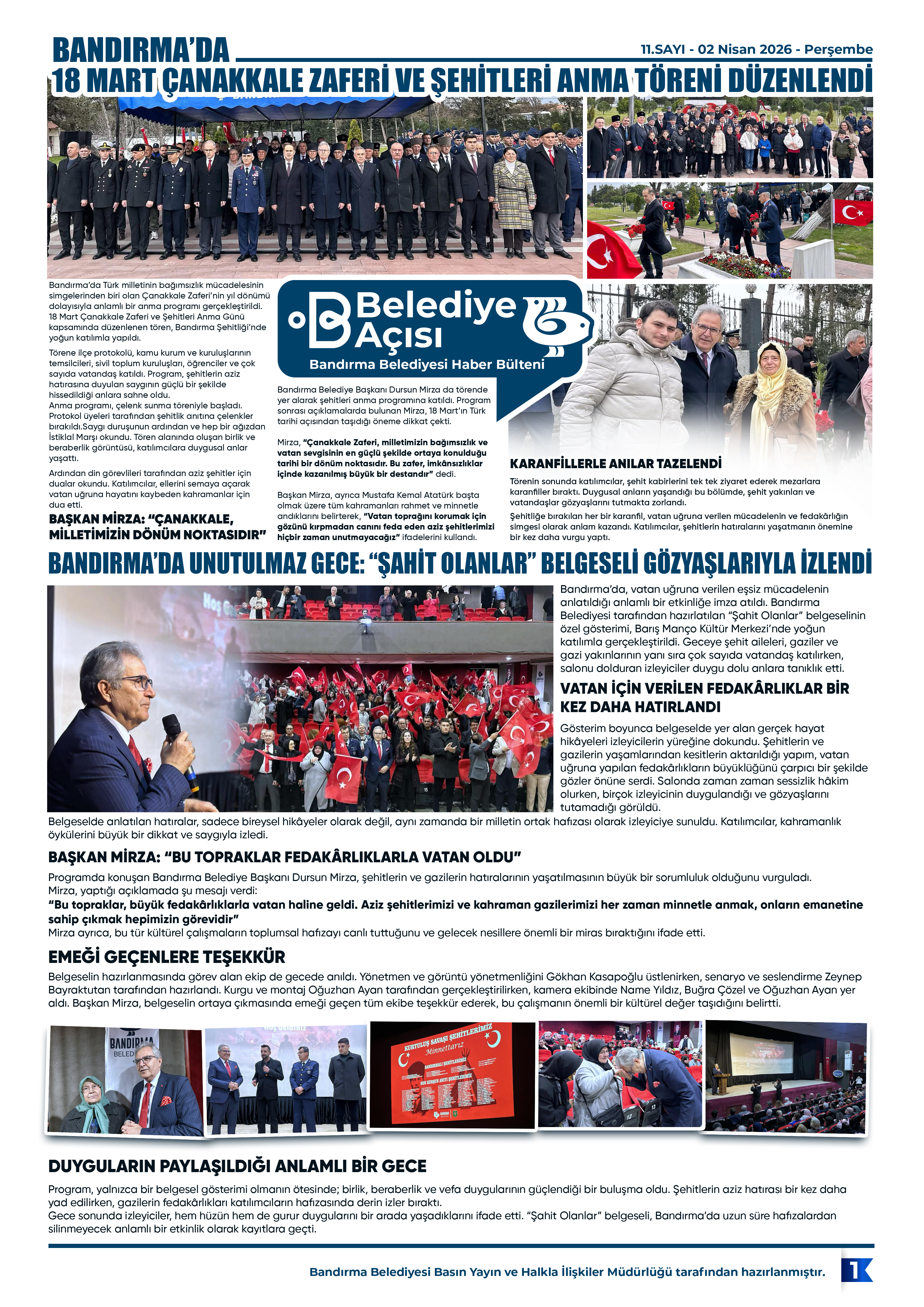 Bandırma Belediyesi’nin 1 aylık haber bülteni “Belediye Açısı” 11. sayısıyla dijital platformlarda sizlerle! 👇
