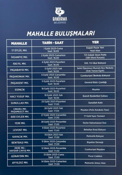 Belediye Başkanı Av. Tolga Tosun, konu ile ilgili yaptığı açıklamada, “Bandırmamızın gelecek planlamasını, katılımcı yönetim anlayışıyla vatandaşlarımızla birlikte tasarlamak istiyoruz. Hemşehrilerimizin, kentimizin yaşam kalitesini yükseltecek görüşlerini dinlemek, şehrimizi birlikte yönetmek için bütün hemşehrilerimizi Mahalle Buluşmalarımıza davet ediyoruz,” dedi.