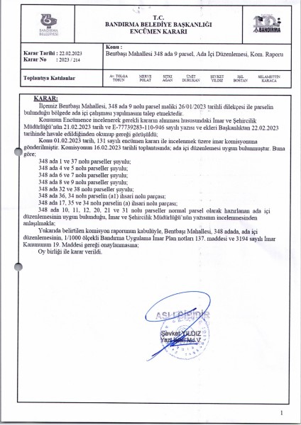 Belediye Encümeninin 22.02.2023 tarih ve 214 sayılı Encümen kararı ile Bentbaşı Mahallesi 348 adaya ait ada içi düzenlemesinin, 1/1000 ölçekli Bandırma Uygulama İmar Planı notlarının 137. Maddesi ve 3194 sayılı İmar Kanununun 19. maddesi gereği onaylanmasına,