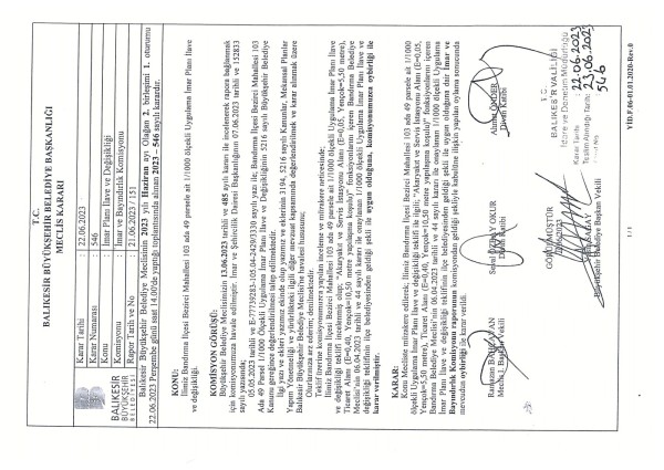 Onaylanan, Plan değişikliği teklifi Balıkesir Büyükşehir Belediyesi Meclisinin 22.06.2023 tarih ve 546 sayılı kararı ile onanmış olup, 3194 sayılı İmar Kanunun 8/b maddesine istinaden bir ay süre ile ilan edilmek üzere askıya çıkarılmış olup; Belediyemiz İnternet sitesinde yayınlanmaktadır.