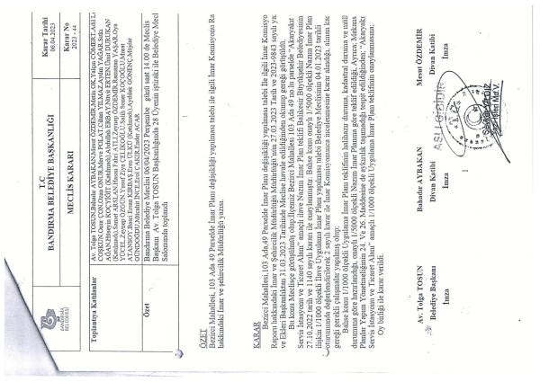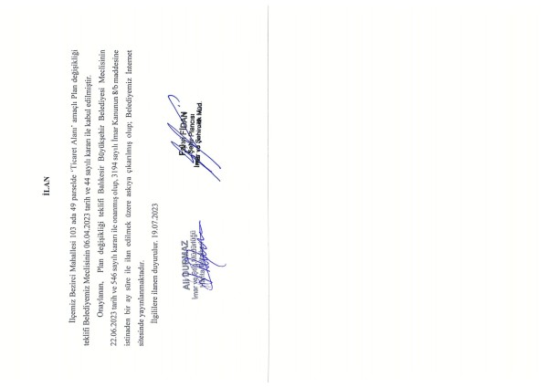 İlçemiz Bezirci Mahallesi 103 ada 49 parselde ‘Ticaret Alanı’ amaçlı Plan değişikliği teklifi Belediyemiz Meclisinin 06.04.2023 tarih ve 44 sayılı kararı ile kabul edilmiştir.
