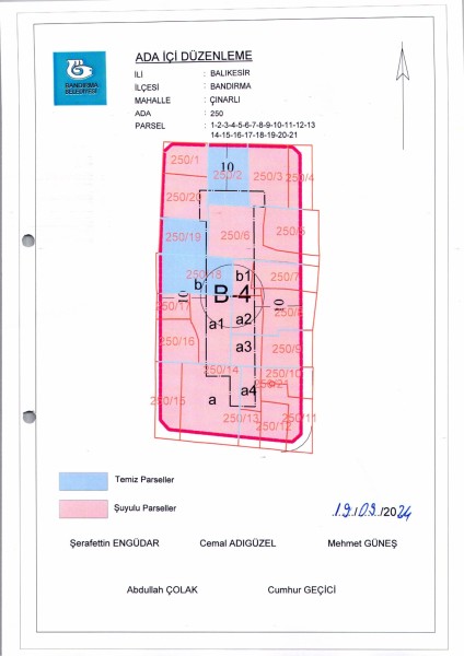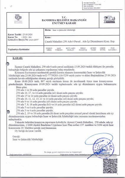 Belediye Encümeninin 25.09.2024 tarih ve 894 sayılı Encümen kararı ile Çınarlı Mahallesi, 250 ada, 1-2-3-4-5-6-7-8-9-10-11-12-13-14-15-16-17-18-19-20-21 nolu parsellere ait ada içi düzenlemesinin, 1/1000 ölçekli Bandırma Uygulama İmar Planı notlarının 137. Maddesi ve 3194 sayılı İmar Kanununun 19. maddesi gereği onaylanmasına,