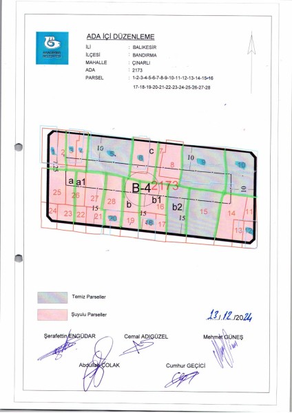 Belediye Encümeninin 18.12.2024 tarih ve 1233 sayılı Encümen kararı ile Çınarlı Mahallesi, 2173 ada 1, 2, 3, 4, 5, 6, 7, 8, 9, 10, 11, 12, 13, 14, 15, 16, 17, 18, 19, 20, 21, 22,23, 24, 25, 26, 27, 28 nolu parsellere ait ada içi düzenlemesinin, 1/1000 ölçekli Bandırma Uygulama İmar Planı notlarının 137. Maddesi ve 3194 sayılı İmar Kanununun 19. maddesi gereği onaylanmasına,
