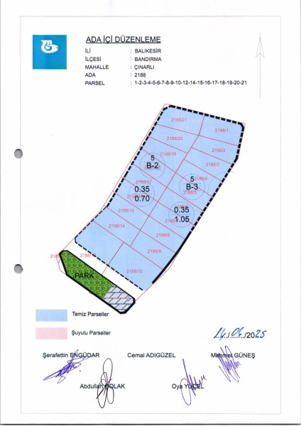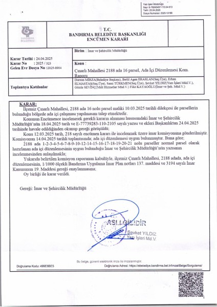 Belediye Encümeninin 24.04.2025 tarih ve 323 sayılı Encümen kararı ile Yenimahalle, Çınarlı Mahallesi 2188 ada 1-2-3-4-5-6-7-8-9-10-12-14-15-16-17-18-19-20-21 nolu parsellere ait ada içi düzenlemesinin, 1/1000 ölçekli Bandırma Uygulama İmar Planı notlarının 137. Maddesi ve 3194 sayılı İmar Kanununun 19. maddesi gereği onaylanmasına,