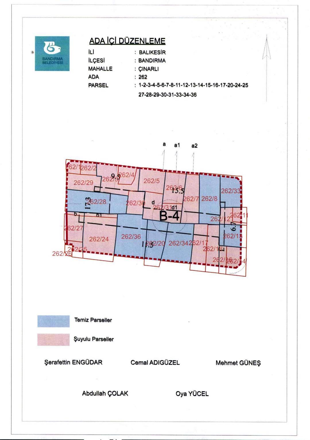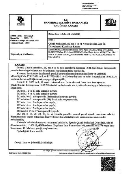 Belediye Encümeninin 18.02.2026 tarih ve 171 sayılı Encümen kararı ile, Çınarlı Mahallesi, 262 ada, 1-2-3-4-5-6-7-8-11-12-13-14-15-16-17-20-24-25-27-28-29-30-31-33-34-36 nolu parsellere ait ada içi düzenlemesinin, 1/1000 ölçekli Bandırma Uygulama İmar Planı notlarının 164. Maddesi ve 3194 sayılı İmar Kanununun 19. maddesi gereği onaylanmasına,