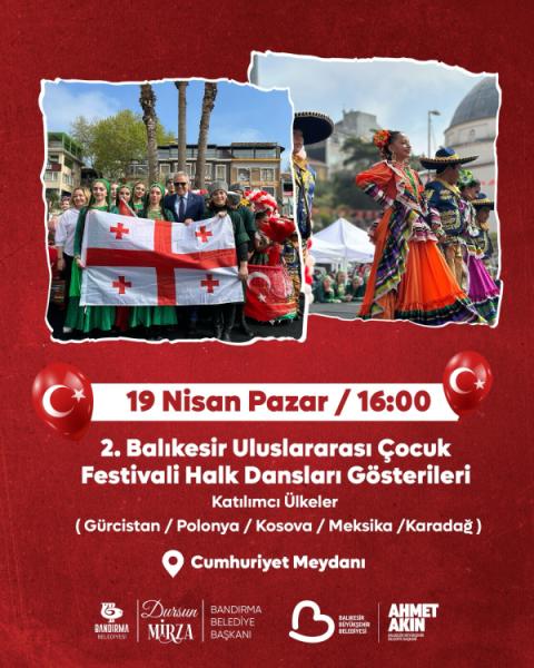 Çocukların Bayramı Çocukların Neşesi Cumhuriyetimizin kurucusu Ulu Önder Gazi Mustafa Kemal Atatürk’ün tüm dünya çocuklarına armağan ettiği 23 Nisan Ulusal Egemenlik ve Çocuk Bayramı’nda güçlü yarınlarımızın temeli çocuklarımıza unutulmaz bir bayram coşkusu yaşatmaya hazırlanıyoruz. Özenle hazırlanan bayram etkinlikleriyle onların bayram sevincine ortak oluyoruz. 19 Nisan Pazar 16:00 - 2.Balıkesir Uluslararası Çocuk Festivali 23 Nisan Perşembe 17:00 - Ayşe Kayacan ile Masal Saati 18:00 – Bodoslama (Konser) 24 Nisan Cuma 17:00 - Harun Karacan Gençlik ve Spor Merkezi 23 Nisan Sergisi 25 Nisan Cumartesi 14:00 – Bandırma Belediyesi 23 Nisan Çocuk Şenliği Gün boyu çocuklarımız için sürpriz etkinlikler ve çocuk kitabı yazarlarının katılımıyla kitap satışı ve imza stantları. Sahne etkinlikleri Cumhuriyet Meydanı’nda gerçekleşecek olup, 23 Nisan sergisi Tunç Başaran Kültür Merkezi’nde sanatseverlerle buluşacaktır.