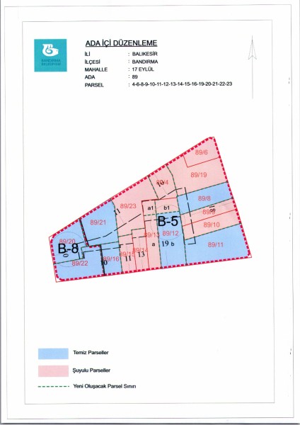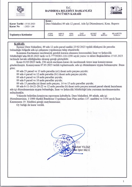 Belediye Encümeninin 15.03.2023 tarih ve 298 sayılı Encümen kararı ile Dere Mahallesi 89 ada 4-6-8-9-10-11-12-13-14-15-16-19-20-21-22-23 nolu parsellere ait ada içi düzenlemesinin, 1/1000 ölçekli Bandırma Uygulama İmar Planı notlarının 137. Maddesi ve 3194 sayılı İmar Kanununun 19. maddesi gereği onaylanmasına,