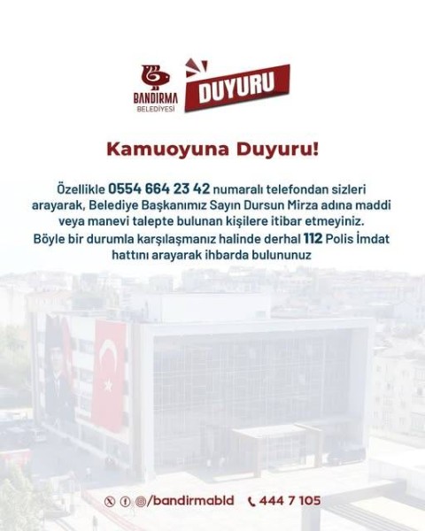 DİKKAT! Belediye Başkanımız Sn. Dursun Mirza’nın adını kullanarak, özellikle 0554 664 23 42 numarasından arayıp maddi-manevi talepte bulunan kişilere itibar etmeyiniz. Böyle bir durumda 112 Polis İmdat hattını arayınız.