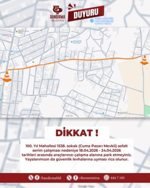 100. Yıl Mahallemizde, 1538. Sokak (Cuma Pazarı Mevkii) üzerinde gerçekleştireceğimiz asfalt serim çalışmaları 18 Nisan – 24 Nisan tarihleri arasında devam edecektir. Çalışmalar süresince hemşehrilerimizin araçlarını belirtilen güzergâha park etmemelerini ve güvenlik levhalarına dikkat etmelerini rica ediyoruz.