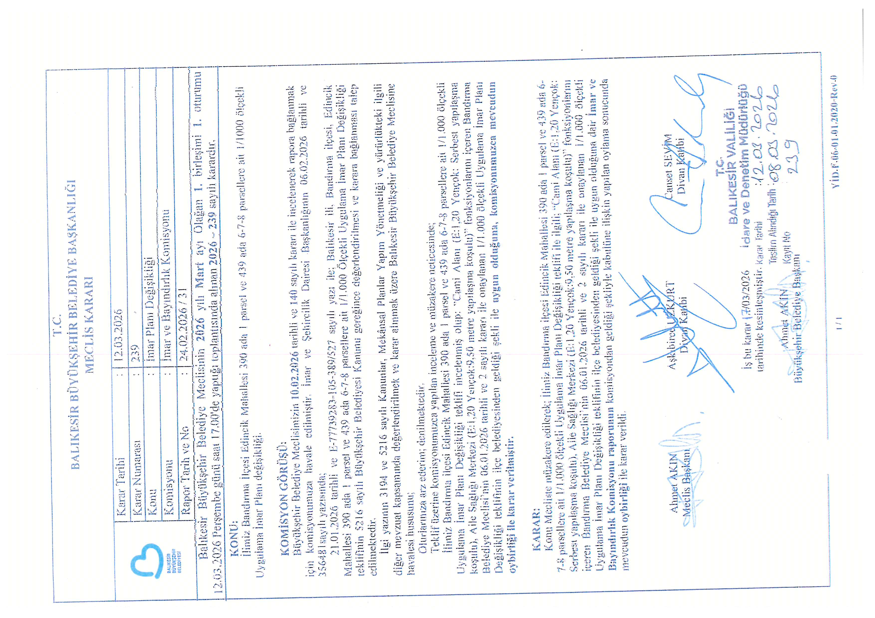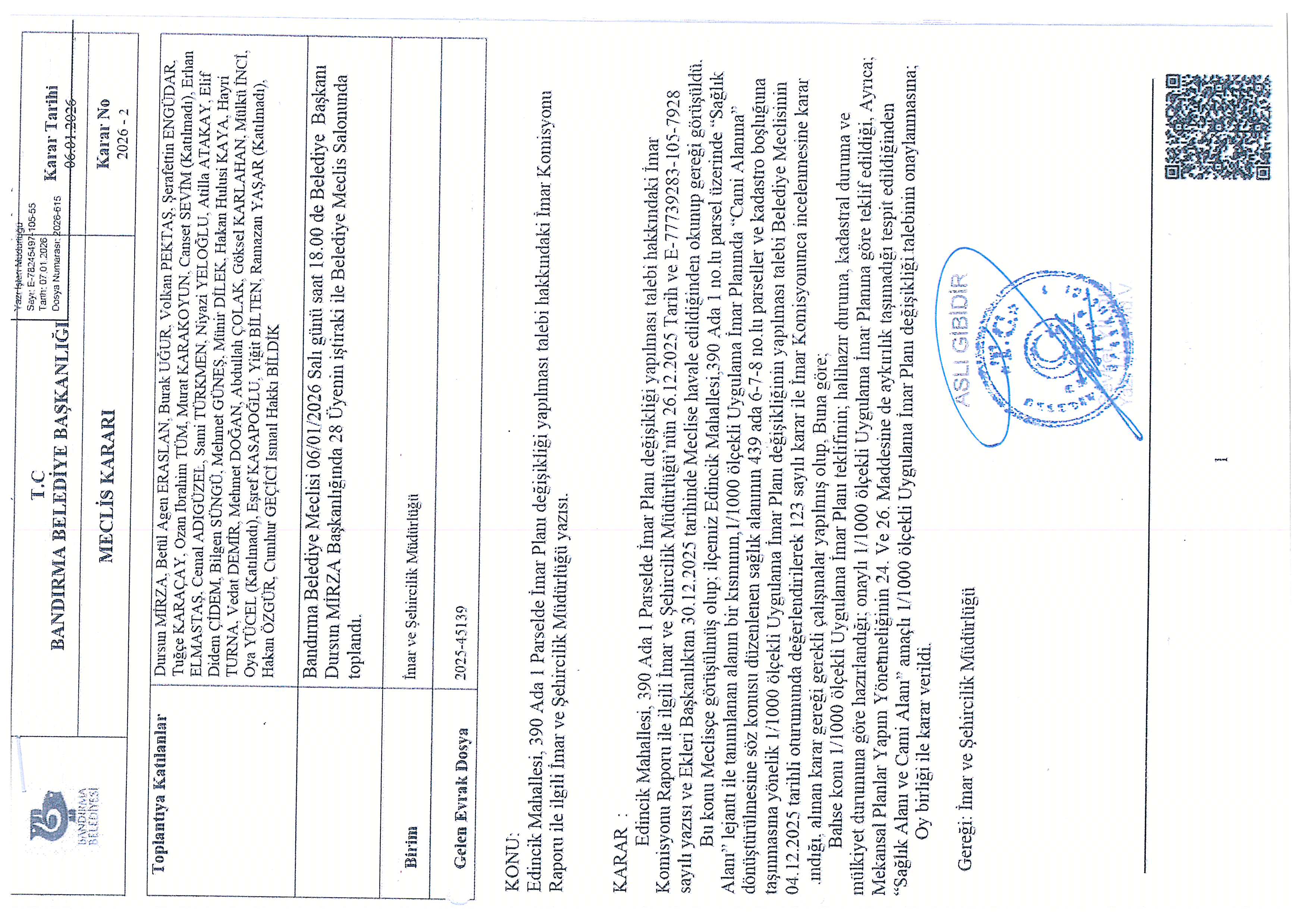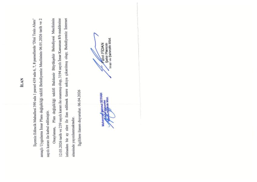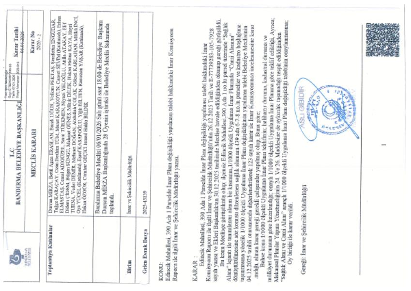 İlçemiz Edincik Mahallesi 390 ada 1 parsel 439 ada 6, 7, 8 parsellerde ‘Dini Tesis Alanı’ amaçlı Uygulama İmar Planı değişikliği teklifi Belediyemiz Meclisinin 06.01.2026 tarih ve 2 sayılı kararı ile kabul edilmiştir.