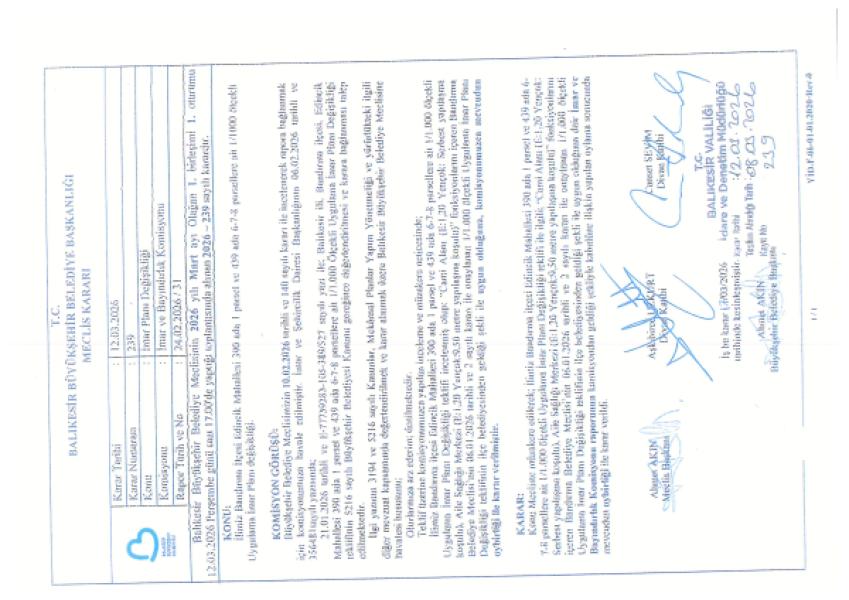 Onaylanan, Plan değişikliği teklifi Balıkesir Büyükşehir Belediyesi Meclisinin 12.03.2026 tarih ve 239 sayılı kararı ile onanmış olup, 3194 sayılı İmar Kanunun 8/b maddesine istinaden bir ay süre ile ilan edilmek üzere askıya çıkarılmış olup; Belediyemiz İnternet sitesinde yayınlanmaktadır.