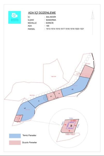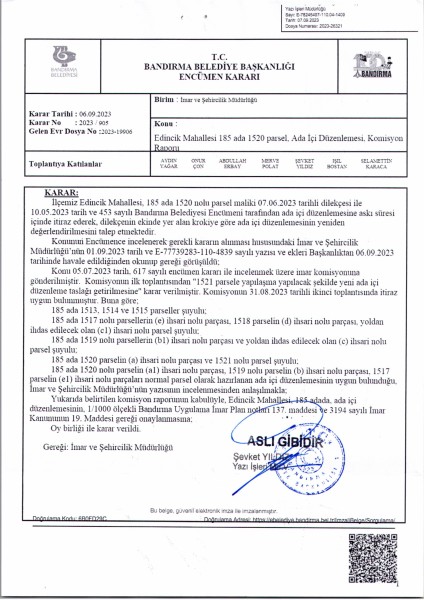 Belediye Encümeninin 06.09.2023 tarih ve 905 sayılı Encümen kararı ile Edincik Mahallesi, 185 ada 1513-1514-1515-1517-1518-1519-1520-1521 parsele ait ada içi düzenlemesinin, 1/1000 ölçekli Bandırma Uygulama İmar Planı notlarının 137. Maddesi ve 3194 sayılı İmar Kanununun 19. maddesi gereği onaylanmasına,
