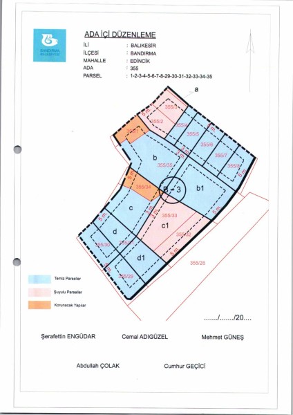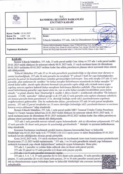 Belediye Encümeninin 05.03.2025 tarih ve 198 sayılı Encümen kararı ile Edincik Mahallesi, 355 ada 1-2-3-4-5-6-7-8-29-30-31-32-33-34-35 nolu parsellere ait ada içi düzenlemesinin, 1/1000 ölçekli Bandırma Uygulama İmar Planı notlarının 137. Maddesi ve 3194 sayılı İmar Kanununun 19. maddesi gereği onaylanmasına,