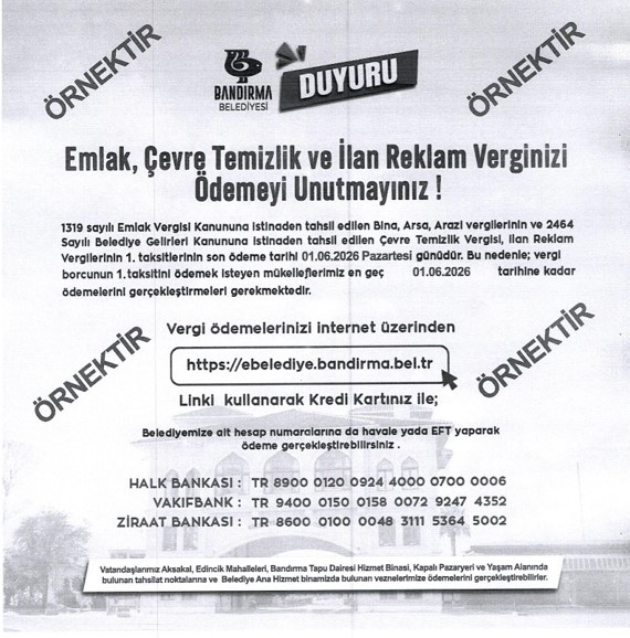 1319 sayılı Emlak Vergisi Kanununa istinaden tahsil edilen Bina, Arsa, Arazi vergilerinin ve 2464 Sayılı Belediye Gelirleri Kanununa istinaden tahsil edilen Çevre Temizlik Vergisi, İlan Reklam Vergilerinin 1. taksitlerinin son ödeme tarihi 01 Haziran 2026 Pazartesi günüdür. Bu nedenle; vergi borcunun 1. taksitini ödemek isteyen mükelleflerimizin en geç 01 Haziran 2026 tarihine kadar ödemelerini gerçekleştirmeleri gerekmektedir.