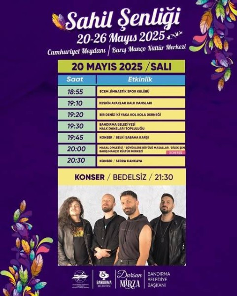 Festivalin Habercisi Bandırma Sahil Şenliği Başlıyor! 20 Mayıs’tan itibaren Bandırma, müzikle, dansla, eğlenceyle dolup taşacak! Geleneksel Sahil Şenliği’nde, Bandırma’nın yetenekli müzik grupları, dans ekipleri ve sanat toplulukları sahne alıyor, enerji tavan, ritim ve coşku hiç durmak bilmiyor. Hazırsan gel, bu coşkuyu kaçırma! 20 Mayıs 2025 Bandırma Cumhuriyet Meydanı / Barış Manço Kültür Merkezi