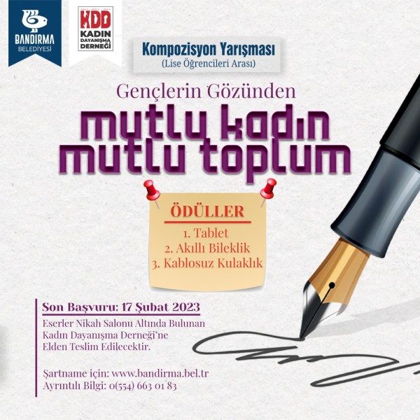Gençlerin Gözünden Mutlu Kadın Mutlu Toplum kompozisyon yarışması katılım şartnamesi'ni ve katılım koşullarını Dökümanlar kısmında görebilirsiniz.