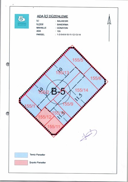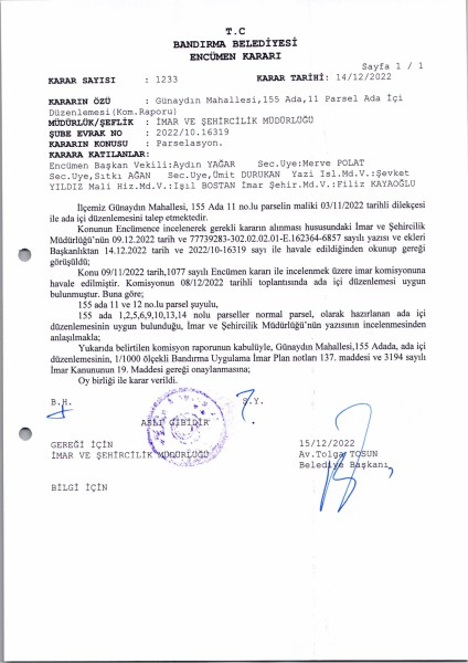 Belediye Encümeninin 14/12/2022 tarih ve 1233 sayılı Encümen kararı ile Günaydın Mahallesi, 155 adaya ait ada içi düzenlemesinin, 1/1000 ölçekli Bandırma Uygulama İmar Planı notlarının 137. Maddesi ve 3194 sayılı İmar Kanununun 19. maddesi gereği onaylanmasına,