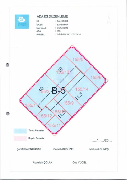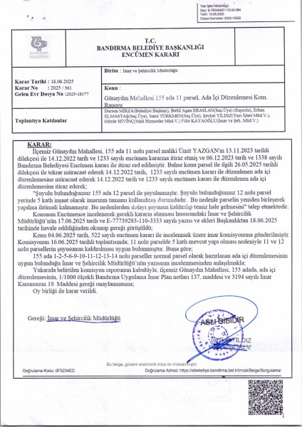 Belediye Encümeninin 18.06.2025 tarih ve 561 sayılı Encümen kararı ile, Günaydın Mahallesi, 155 ada 1-2-5-6-9-10-11-12-13-14 nolu parsellere ait ada içi düzenlemesinin, 1/1000 ölçekli Bandırma Uygulama İmar Planı notlarının 137. Maddesi ve 3194 sayılı İmar Kanununun 19. maddesi gereği onaylanmasına,