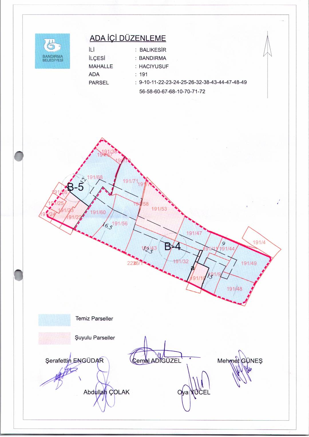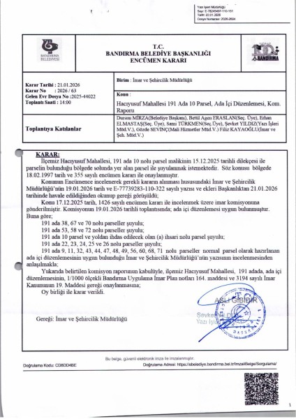 Belediye Encümeninin 21.01.2026 tarih ve 63 sayılı Encümen kararı ile, Hacıyusuf Mahallesi, 191 ada, 9-10-11-22-23-24-25-26-32-38-43-44-47-48-49-56-58-60-67-68-70-71-72 nolu parsellere ait ada içi düzenlemesinin, 1/1000 ölçekli Bandırma Uygulama İmar Planı notlarının 164. Maddesi ve 3194 sayılı İmar Kanununun 19. maddesi gereği onaylanmasına,