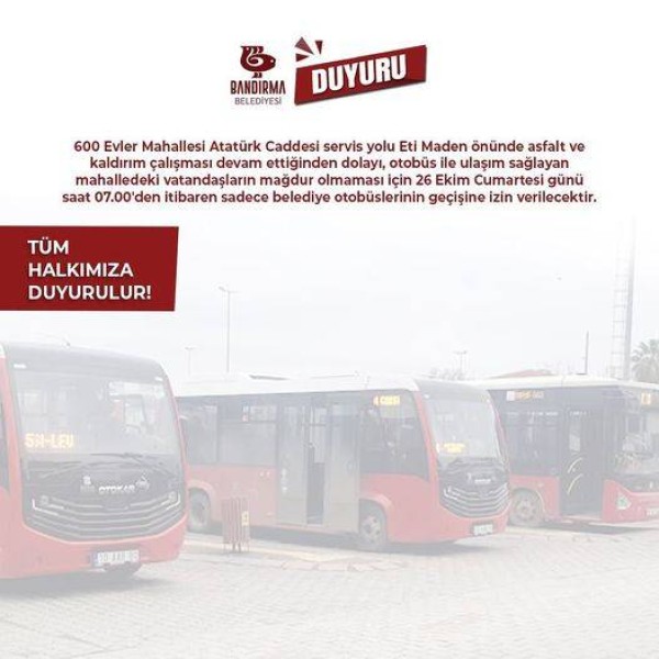 00 Evler Mahallesi Atatürk Caddesi servis yolu Eti Maden önünde asfalt ve kaldırım çalışmaları devam ettiğinden dolayı, mahalledeki vatandaşlarımızın mağduriyet yaşamaması için 26 Ekim Cumartesi günü saat 07.00’den itibaren sadece belediye otobüslerinin geçişine izin verilecektir. Halkımıza önemle duyurulur.