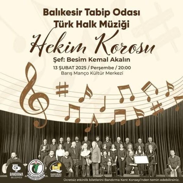 Balıkesir Tabip Odası Hekim Korosu müziğin iyileştirici ve birleştirici gücünü sizlere sunuyor. Sağlık çalışanlarının sanata olan ilgisini ve yeteneklerini gözler önüne sunan Balıkesir Tabip Odası Hekim Korosu “Türk Halk Müziği” konser programı kapsamında bizlerle buluşuyor. Bandırma Belediyesi, Kent Konseyi ve Balıkesir Tabip Odası iş birliği ile hazırlanan bu ücretsiz etkinliğe tüm halkımız davetlidir. 13 Şubat Perşembe / Saat 20:00 / Santral Kültür Merkezi Ücretsiz biletlerinizi Bandırma Kent Konseyi’nden temin edebilirsiniz.