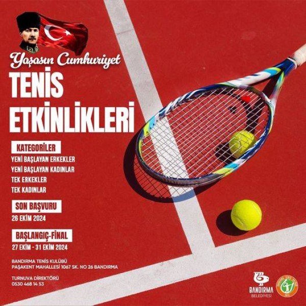 Bandırma Belediyesi olarak, Cumhuriyetimizin coşkusunu tenis kortlarında kutluyoruz! Hem yeni başlayanlar hem de deneyimli sporcular için çeşitli kategorilerde düzenlenecek etkinliklere siz de katılın. Son Başvuru Tarihi: 26 Ekim 2024 Etkinlik Tarihi: 27 Ekim – 31 Ekim 2024 Kategoriler: Yeni Başlayan Erkekler Yeni Başlayan Kadınlar Tek Erkekler Tek Kadınlar Yer: Bandırma Tenis Kulübü Paşakent Mahallesi 1067 Sk. No:26 Bandırma Başvurular ve Detaylı Bilgi İçin: Turnuva Direktörü: 0530 468 14 53 Herkesi tenis coşkusuna ortak olmaya ve Cumhuriyet ruhunu hep birlikte yaşamaya davet ediyoruz!