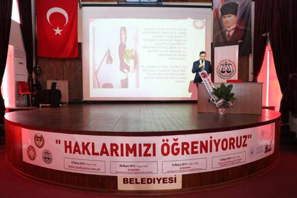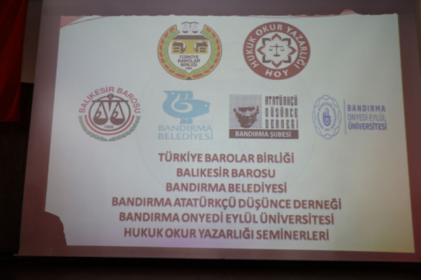HUKUK OKUR, YAZARLIĞI SEMİNERLERİNİN İLKİ GERÇEKLEŞTİ   Bandırma Belediyesi’nin öncülüğünde düzenlenen Hukuk Okur Yazarlığı Seminerlerinin ilki olan “İşten Çıkarılmada Haklar” semineri gerçekleşti.   Av. Yusuf Güleşçi tarafından verilen seminer yaklaşık 2 saat sürdü. İşten çıkarılmadan sonra yapılması gerekenler ve tazminat alma hakları konusunda çok faydalı bilgiler sunan Av. Yusuf Güleşçi interaktif olarak dinleyicilerin sorularını yanıtladı.   Seminer sonunda Belediye Meclis Üyemiz Av. Merve Polat desteklerinden ve katılımlarından dolayı Av. Yusuf Güleşçiye teşekkür ederek Bandırmayı temsil eden plaketini takdim etti.