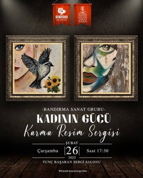 Şuna inanmak lazımdır ki dünya üzerinde gördüğümüz her şey kadının eseridir. M. Kemal Atatürk Hayatın tüm zorluklarını göğüsleyen ve bu zorluklara karşı hayatımızı güzelleştiren tüm kadınlara ithafen Bandırma Sanat Grubu tarafından hazırlanan “Kadının Gücü” karma resim sergisi kapılarını sizler için açıyor. Tüm halkımız davetlidir. 26 Şubat Çarşamba - Saat 17.30 - Tunç Başaran Sergi Salonu