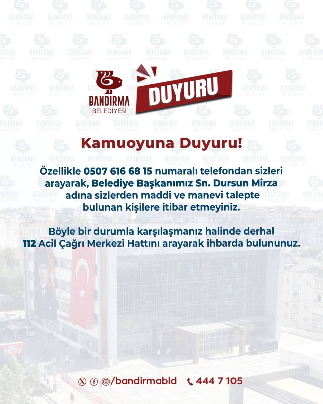 Son günlerde bazı kişilerin 0507 616 68 15 numaralı telefondan vatandaşlarımızı arayarak, Belediye Başkanımız Sn. Dursun Mirza adına maddi ve manevi taleplerde bulunduğu yönünde ihbarlar alınmaktadır.