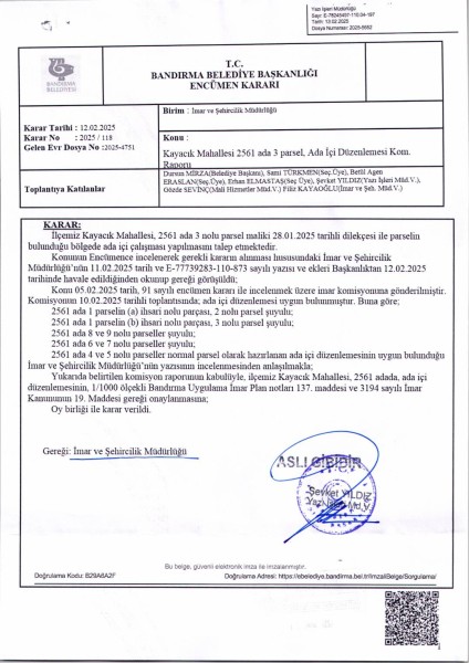 Belediye Encümeninin 12.02.2025 tarih ve 118 sayılı Encümen kararı ile Kayacık Mahallesi, 2561 ada 1-2-3-4-5-6-7-8-9 nolu parsellere ait ada içi düzenlemesinin, 1/1000 ölçekli Bandırma Uygulama İmar Planı notlarının 137. Maddesi ve 3194 sayılı İmar Kanununun 19. maddesi gereği onaylanmasına,