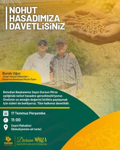 Köyümüzün bereketi, emeğimizin karşılığı için bir araya geliyoruz. Belediyemize ait tarlada gerçekleştireceğimiz nohut hasadına sizleri de davet ediyoruz. Üretimin kıymetini, emeğin değerini hep birlikte paylaşmak istiyoruz. 17 Temmuz Perşembe 11:00 Çepni Mahallesi (Belediyemize ait tarla) Tüm hemşehrilerimizi bekliyoruz.