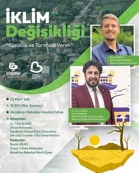 Bandırma Belediyesi ve Balıkesir Büyükşehir Belediyesi iş birliğiyle, “Kuraklık ve Tarımsal Verim” konulu iklim değişikliği paneline siz değerli hemşehrilerimizi bekliyoruz. Tarih: 25 Mart Salı Saat: 19.30 (İftar sonrası) Yer: Akçapınar Mahallesi Meydan Kahve Konuşmacı: Dr. Cem ALDAĞ Ziraat Mühendisi – Bandırma Onyedi Eylül Üniversitesi Teknoloji Transfer Ofisi Genel Müdürü Moderatör: Burak UĞUR Ziraat Yüksek Mühendisi – Bandırma Belediye Meclis Üyesi İklim krizinin tarımsal üretim üzerindeki etkilerini bilimsel perspektifle değerlendireceğimiz bu anlamlı buluşmada sizleri de aramızda görmekten mutluluk duyarız.