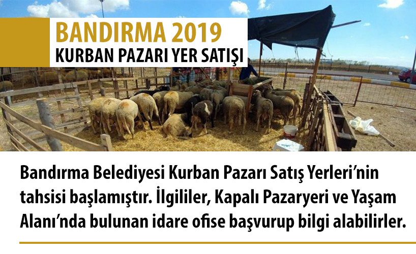 KURBAN SATIŞI YAPMAK İSTEYENLERİN DİKKATİNE Bandırma Belediyesi Kurban Satış Yeri Parselleri satışı başlamıştır. Kurban Bayramı öncesinde Bandırma Belediyesi Kurban Pazarında yer alan satış parsellerinin tahsis işlemleri bugün itibariyle başlamıştır. İlgililerin Bandırma Belediyesi Kapalı Pazar Yeri ve Yaşam Alanında yer alan İdari Ofiste yetkililerden bilgi alarak tahsis işlemini gerçekleştirebilirler.