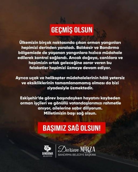 Ülkemizin dört bir yanında çıkan orman yangınları, doğamızı, can dostlarımızı ve ortak geleceğimizi tehdit etmeye devam ediyor. Balıkesir ve Bandırma bölgemizde yaşanan yangınlara hızlıca müdahale edilerek kontrol sağlanmış olsa da, bu felaketlerin yarattığı tahribat hepimizi derinden üzüyor. Uçak ve helikopter müdahalelerinin hâlâ yetersiz kalması, eksikliklerin giderilememesi ise yaşanan acıyı daha da büyütüyor. Görevleri başında yaşamını yitiren orman işçileri ve gönüllü vatandaşlarımızı rahmetle anıyor, ailelerine sabır diliyorum. Milletimizin başı sağ olsun.