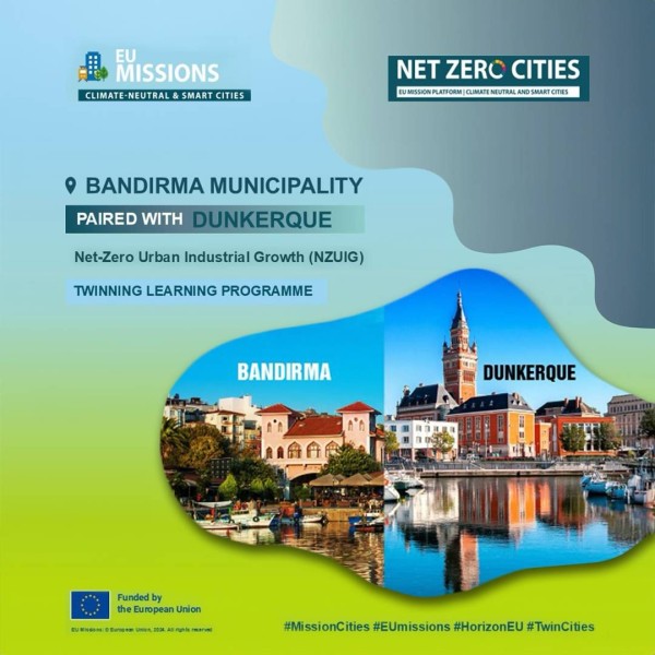 Bandırma Belediyesi olarak AB Şehirleri Misyonunun bir parçası olarak @netzerocitieseu tarafından uygulanan Eşleştirme Öğrenme Programına katılmaktan gurur duyuyoruz. Türkiye’den 3, Avrupa’dan toplam 24 şehirin katılma hakkı kazandığı öğrenme ve işbirliği yolculuğunda ,Bandırma Belediyesi Fransa’dan Dunkerque ile eşleştirildi. Şehrimiz, iklim nötrlüğüne ulaşmak için Net Sıfır Kentsel-Endüstriyel Büyüme (Net-Zero Urban-Industrial Growth) (NZUIG) başlığında 17 aylık bir ortak öğrenme ve yenilik yolculuğunda Communauté urbaine de Dunkerque ile işbirliği yapacak. Bandırma Belediyesi, bilgi alışverişine, etkili iklim nötrlüğü çözümlerinin çoğaltılmasına ve temel zorlukların ele alınmasına yönelik yenilikçi yaklaşımları ele alarak, hazırlamış olduğu SECAP’ın uygulanmasına yönelik faaliyetlere odaklanacak. Bu ortaklık, Avrupa genelindeki şehirlerin sistemik dönüşüm ve iklim nötrlüğü yönünde kararlı adımlar atmasına yardımcı olarak AB Şehirler Misyonunun daha geniş hedeflerini desteklemektedir.