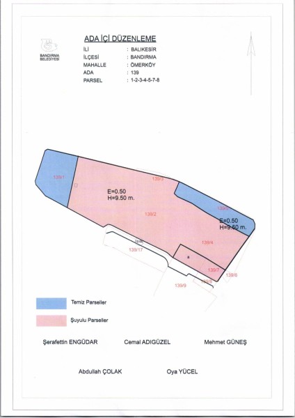 Belediye Encümeninin 18.02.2026 tarih ve 169 sayılı Encümen kararı ile, Ömerli Mahallesi, 139 ada, 1-2-3-4-5-7-8 nolu parsellere ait ada içi düzenlemesinin, 1/1000 ölçekli Bandırma Uygulama İmar Planı notlarının 164. Maddesi ve 3194 sayılı İmar Kanununun 19. maddesi gereği onaylanmasına,
